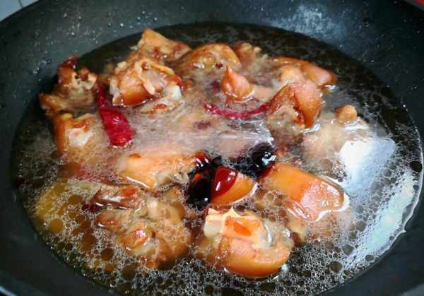 3、锅中倒入适量食用油,冷油中加入冰糖块,小火炒至冒出小泡泡呈黑褐色,倒入焯好的猪蹄,翻炒均匀,并涂上一层糖色。把剩下的所有调料加入猪蹄,炒香,加水没过猪蹄,水不要加太多,加少许盐,生抽2勺,老抽1勺,老抽2勺蚝油适量,汤煮开后转小火慢炖1小时收汁。
