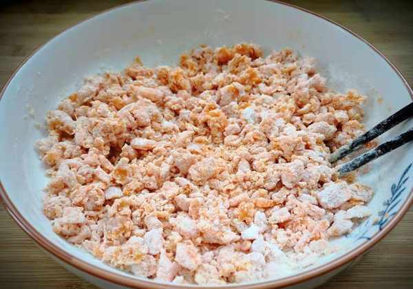 2、将蒸好的红薯倒入盆中,趁热用擀面杖压成红薯泥。不需要加太多,只要能和成面团就行,如果面粉加多了,可以加适量的水。