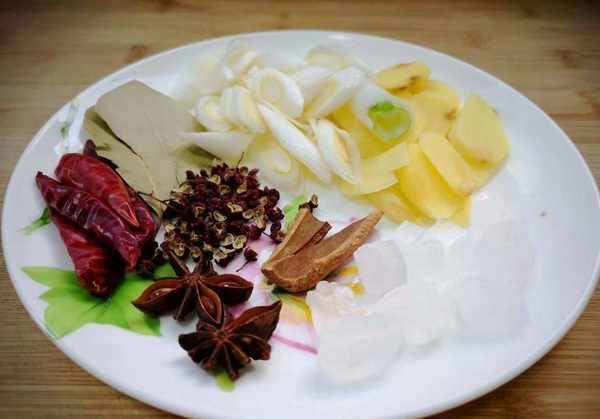 2、准备一些调料,八角2个,干辣椒4个,花椒少许,桂皮,月桂叶少许,姜片适量,葱花,冰糖适量。