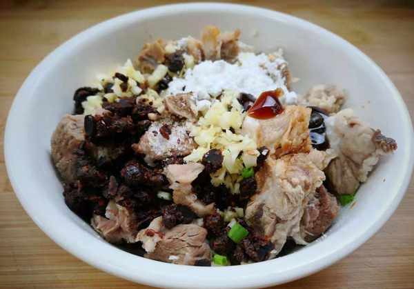 材料:排骨、栗子、豆豉、蒜头、葱、姜、料酒、白胡椒粉、盐、蚝油、酱油、淀粉。