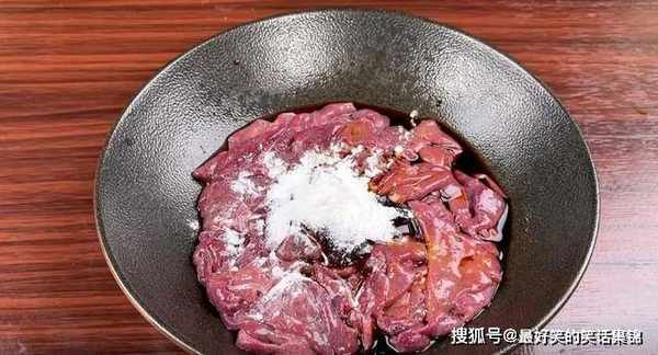 2、继续在猪肝中放食盐、老抽、耗油、淀粉搅拌均匀,用来腌制入味。