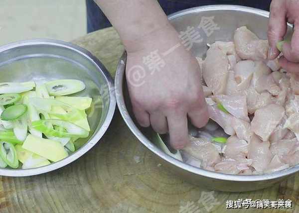 切点生姜片 、大葱段和鸡肉放在一起,淋入一些料酒去腥抓抓揉揉腌个10来分钟给鸡胸肉入味。