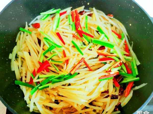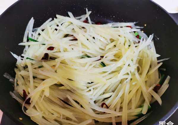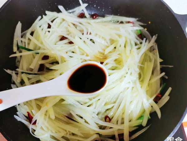 2、想让做出来的土豆丝,看起来颜色不那么重的话,我们可以把香醋给换成白醋来炒。最后倒入醋的时候注意时间,一定要是在土豆丝快要出锅之前再加醋。