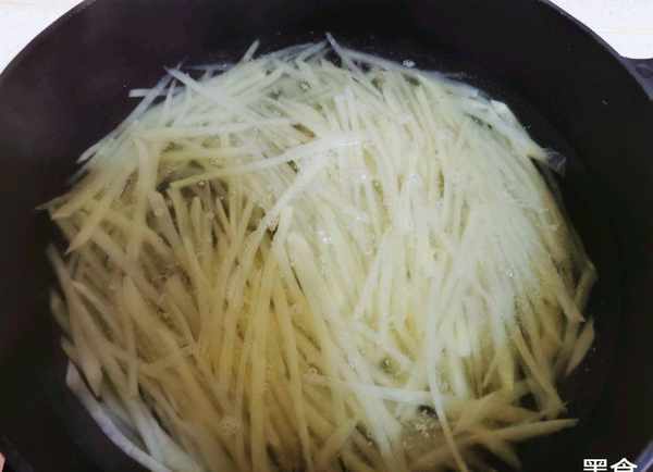 5、锅里面倒入适量的水,先用大火给烧开以后,将土豆丝下进去焯水个1~2分钟左右。然后我们再将土豆丝捞出来,捞出来以后,立即再过几遍凉水,再把水分给沥干。
