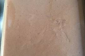 将刚才的蛋糕糊从稍微高一点的地方倒入烤盘。烤盘可以垫油纸或者油布,三能金盘也可以什么都不垫。晃几下把面糊在烤盘铺满,再用力震几下,震掉大气泡。