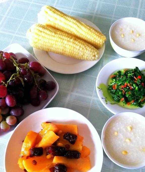 第二天的晚餐:大米糯米小米黄豆粥,蒸玉米,小咸韭菜,红枣枸杞冰糖炖红薯条,