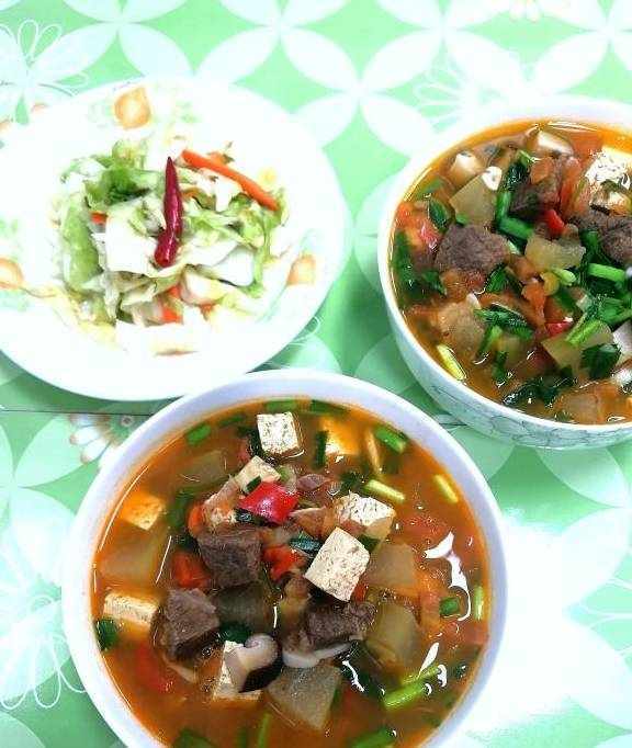 第五天的晚餐:牛肉冬瓜香菇豆腐臊子面,自己做的泡莲花菜。