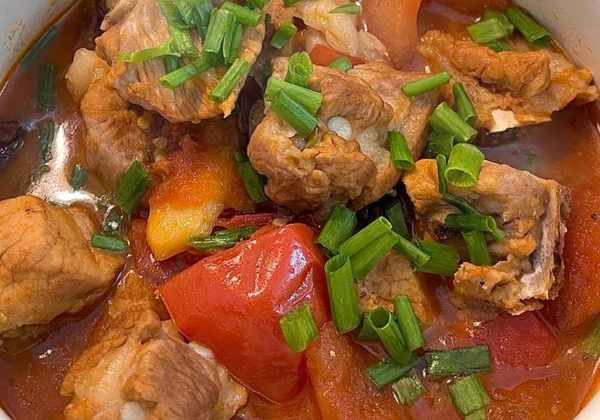 2、起锅烧油,油热后放入姜片爆香,再放入一半番茄翻炒几下,炒出汁后放入排骨翻炒均匀,加入足量清水,盖上盖子炖煮一个小时。