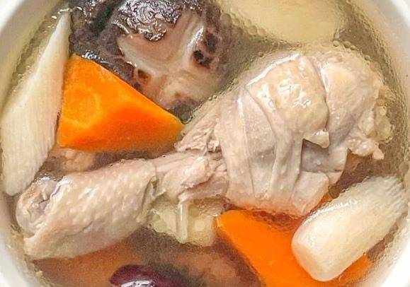 3、将鸡腿、姜片、红枣、山药、香菇和胡萝卜放入汤锅中,加入足量清水,盖上盖子炖煮一个半小时。