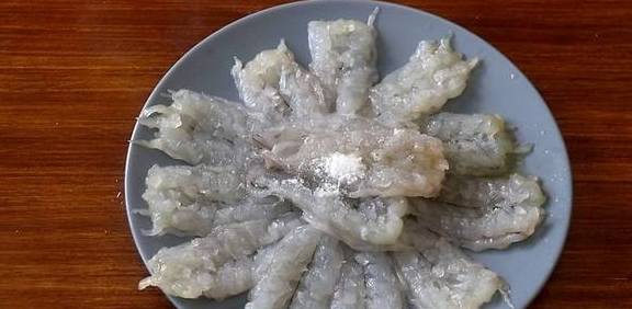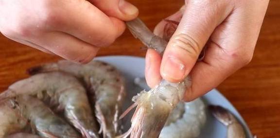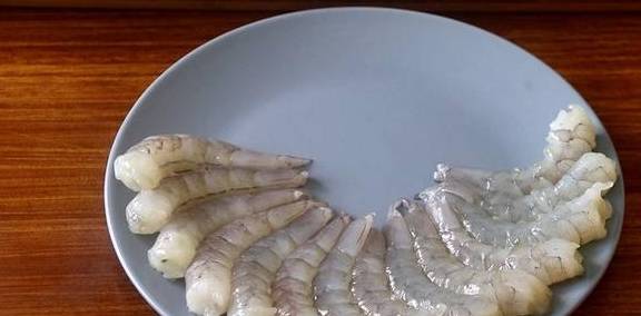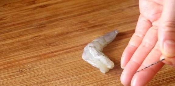 虾去除虾头、虾壳,开虾背,去掉虾线。