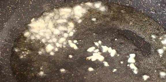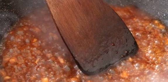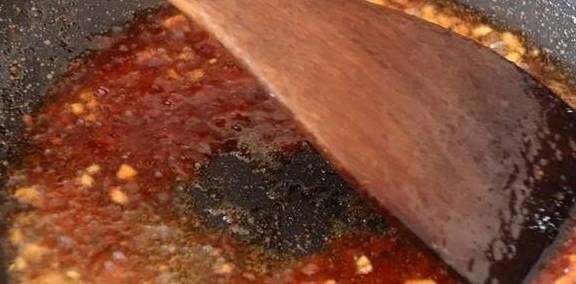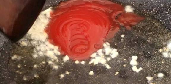 锅内留底油下入蒜末爆香,倒入番茄酱翻炒。