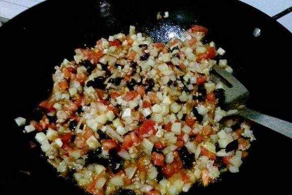 5.倒入除豆腐(我买的是嫩豆腐现在炒就会烂,老豆腐就可以一起倒)以外的菜翻炒,加入盐,酱油,鸡精炒匀