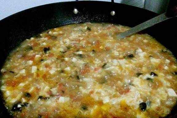 7.倒入鸡蛋液,先不要搅拌,等鸡蛋漂上来以后再搅匀