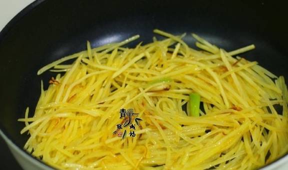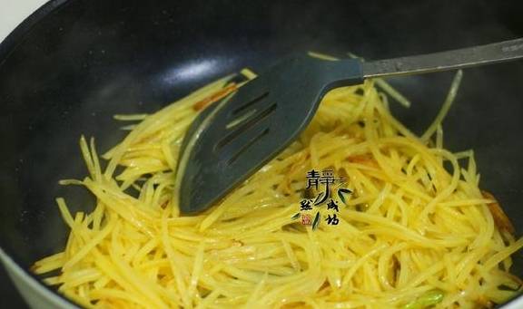5、期间调入少许生抽,一点点清水,炒至土豆丝变色。