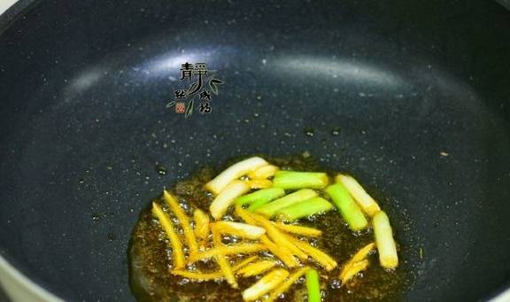 3、热锅热油,下葱姜蒜末炒出香味儿。这里我用的是冰箱里现成的香葱,葱白与葱绿分开,葱绿最后再放。