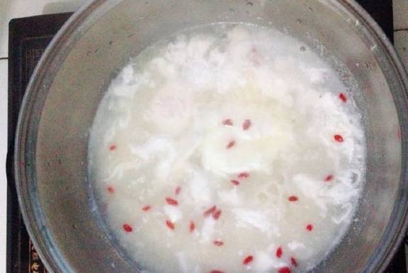 三、随后倒入准备好的甜酒、冰糖、枸杞(甜酒不易熬煮时间太久,以免失去味道哦);