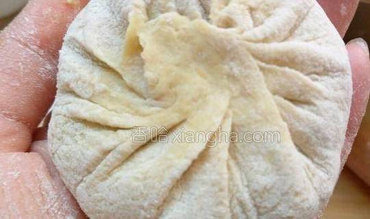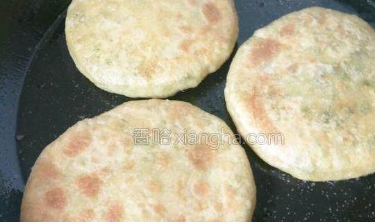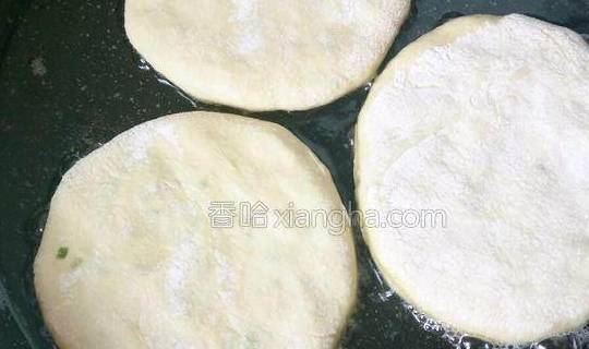 19.平底锅倒入油,开小火,把包好的馅饼放入平底锅里用手压扁!收口朝下放!
