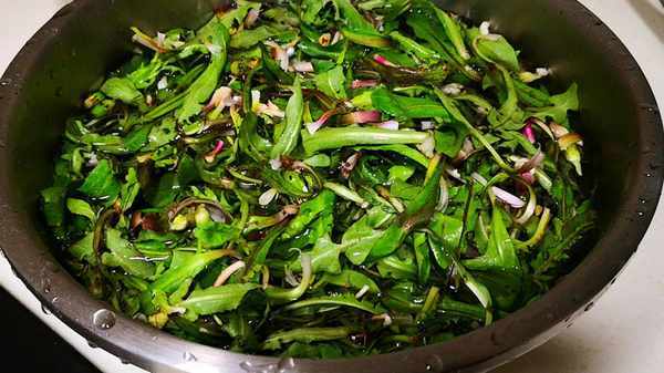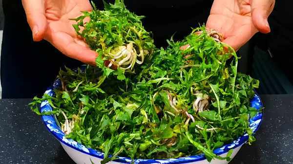 2.蒲公英洗净后将根和叶子分开,蒲公英的根不适合做粥,我们可以单独留着凉拌或蘸酱吃,叶子切细后放入盘中备用。