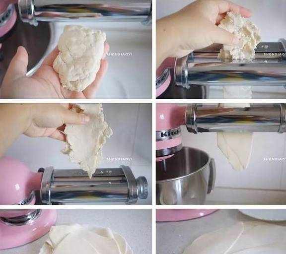 2.厨师机多功能配件接口上安装上压面器配件,压面器配件调至1档,厨师机调至2档,把棉絮状面团放入压面器中压成光滑的扁平状,然后把压面器配件调至2档,把面皮压成自己需要的厚度,拍上干粉待用。