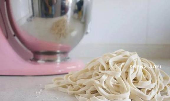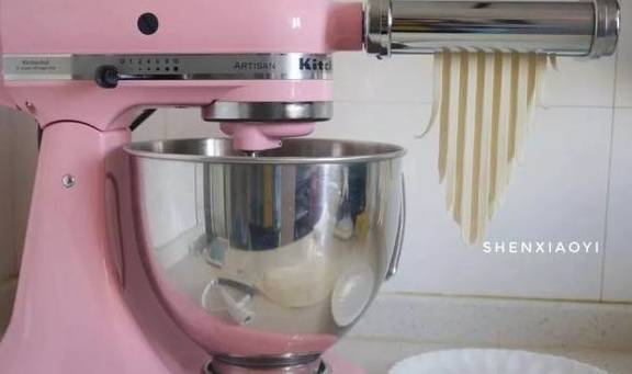 3.厨师机多功能配件接口上安装上切面器配件,厨师机继续2档,把面皮切成面条,在面条上拍上干面粉待用。