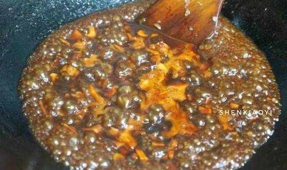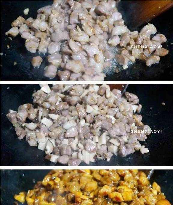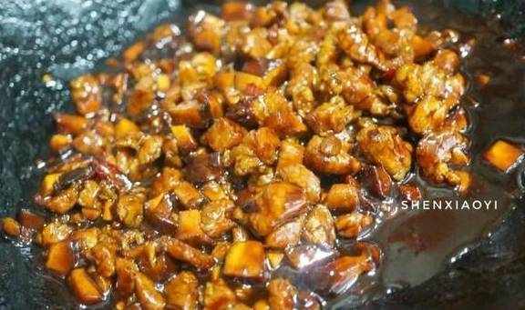5.锅里热油,爆香蒜末,再把猪肉丁放入锅里煸炒至变色,接着把香菇丁放入锅里翻炒至香菇水分挥发,表面出现焦黄。放入红油郫县豆瓣酱和黄豆酱,翻炒均匀。