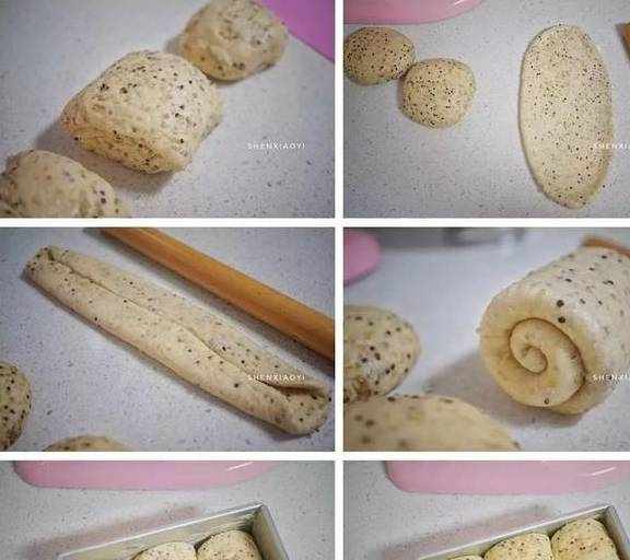 6.把面团分成三团,盖上保鲜膜醒5分钟左右。取一个面团,擀成椭圆形,两边往中间折,然后卷起,其余两个面团也是这么做,把三个面团放入吐司盒,继续发酵半小时左右,发至八分满。