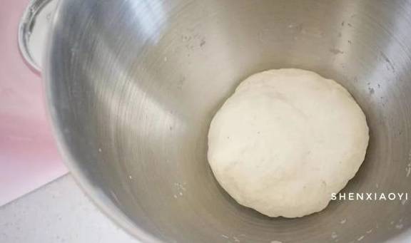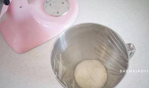 5.把揉好的面团继续放在容器里,盖上保鲜膜,发酵一小时左右,发至两倍大,手指戳洞不回缩就可以啦。