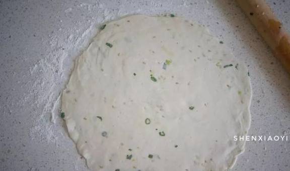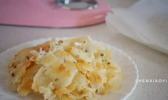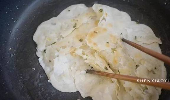 5.平底锅里刷少许油,把擀好的面饼放入锅里,中小火慢慢煎至两面定型金黄,用筷子在饼皮两端夹捏一下。