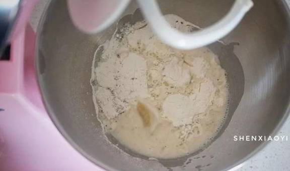 1.把面粉、盐、水,一起放入厨师机,安装搅拌桨,调至2档把面团揉成棉絮状。