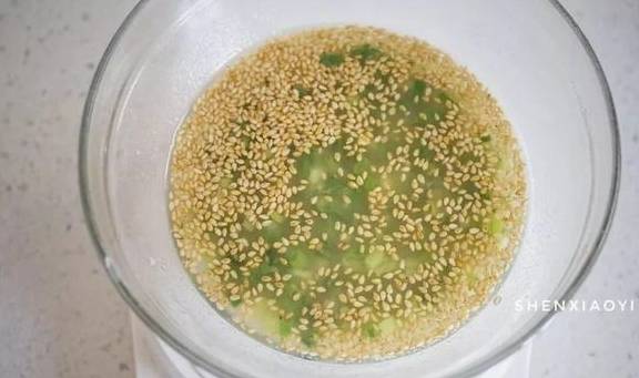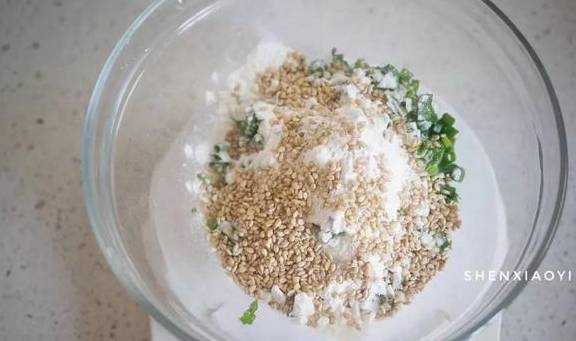 2.在碗里放入葱花、面粉、白芝麻,淋上滚烫的猪油,做成稀油酥。
