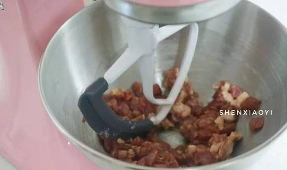 1.把面粉、盐、椒盐、猪油、温水,一起放入KitchenAid厨师机,安装面团勾,调至4档揉匀。把揉好的面团继续放在容器里,盖上保鲜膜,醒30分钟左右。