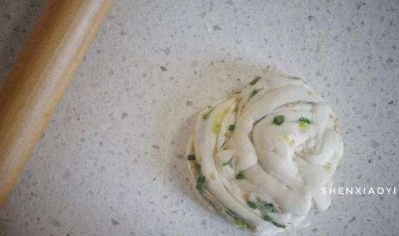 3.醒好的面团不用揉,直接抻开,用刮刀直接切成同等份。取一个面团,用擀面杖擀开擀成长条,中间刷上稀油酥,慢慢卷起来。把面团对半切开,切面朝上叠起来,然后慢慢抻长,像扭麻花一样左右扭起来,再从两端慢慢给它堆起来。