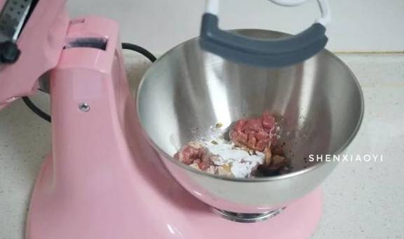 4.把猪肉丁、白胡椒粉、生抽、淀粉,一起放入KitchenAid厨师机(可以用到另一个碗),安装搅拌桨,调至2档把肉丁搅拌均匀,腌制片刻。