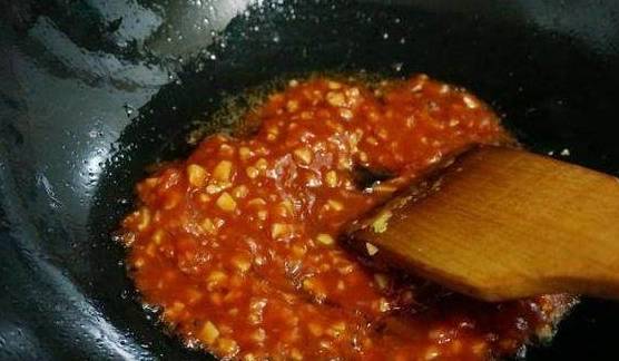 然后把番茄酱放到锅中,小火翻炒出香味