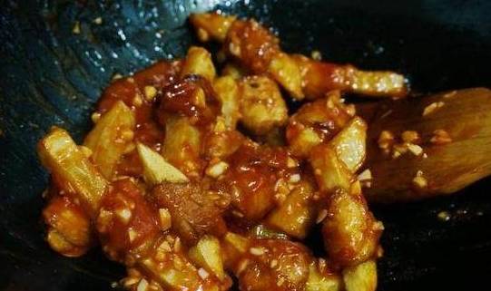 倒入炸好的土豆鸡肉,慢慢翻炒