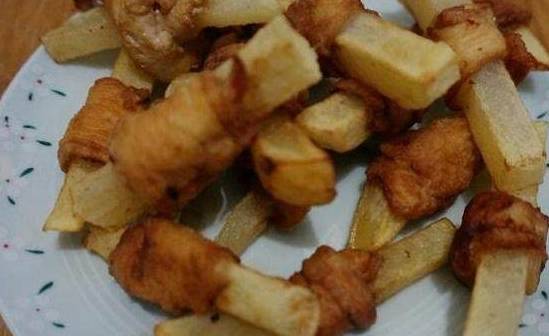 OK,下面,我们就把粘满面粉的土豆鸡肉放到油锅里炸,炸到漂浮起来即可