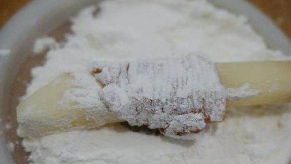 等到土豆都包好肉后,放到面粉中滚下