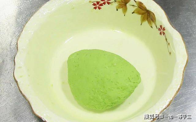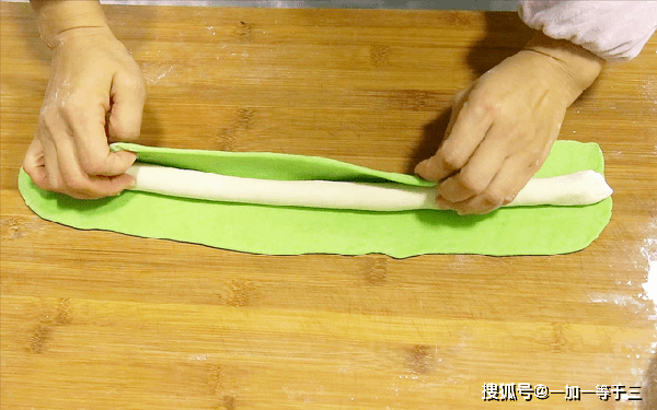 白色的面剂子搓得要比绿色的面团剂子稍粗一点,拿个擀面杖把绿色的面剂子擀成片,包住白色的面剂子,收口处用手捏起来。