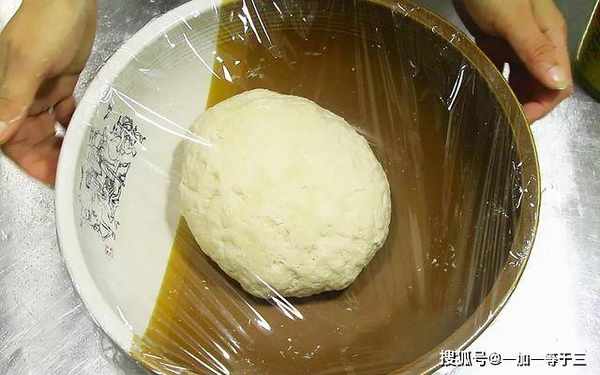 ,边用手搅拌。先把干面粉搅成面絮,搅到盆中没有干面粉的状态。盖上保鲜膜醒发10分钟。