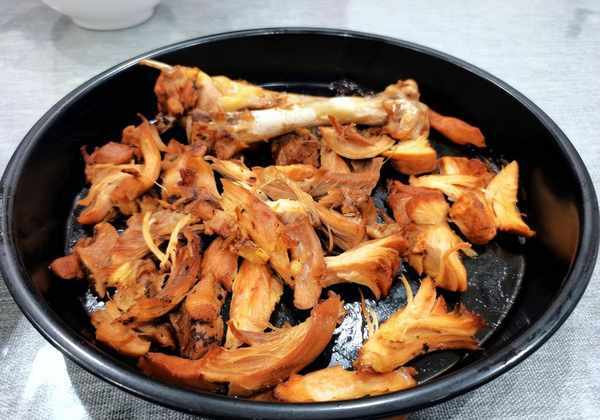 烤鸡大腿:全家人都吃腻了炖鸡腿。今天,我改变了模式。鸡腿炖熟后撕成小条。烤箱上下火200度烤20分钟。食用时撒上烧烤调料或孜然粉。