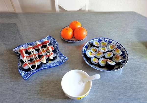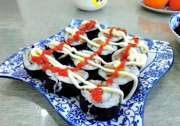 孩子爱吃寿司,晚上就把米饭蒸了,准备了熟牛肉条、寿司萝卜、寿司醋、海带片、沙拉酱、卷寿司用的番茄酱。