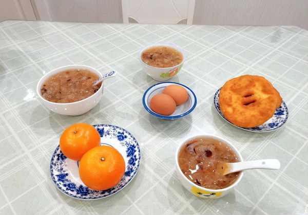 红枣枸杞百合银耳汤,鸡蛋饼,白煮蛋,水果是柑橘。