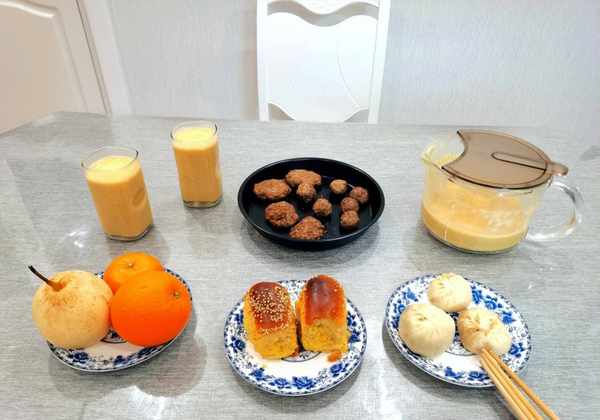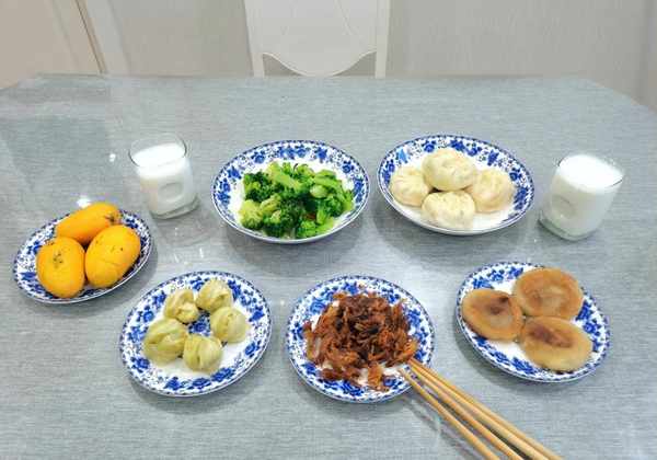 糯米枣泥饼、手撕烤鸡、香豆卷、水煮西兰花、牛肉青萝卜包、热牛奶、芒果。