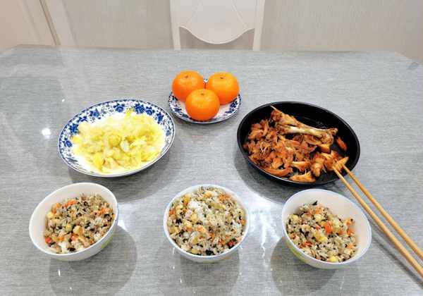 紫菜拌饭,烤鸡大腿,拌卷心菜,水果窝坎。