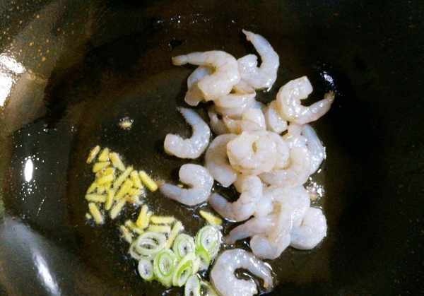 2、起锅烧水,放入少量盐和油,倒入西芹煮1分钟,捞出过凉水后沥干。起锅烧油,放入葱姜炝锅,出香味后倒入腌好的虾仁,翻炒至变色。