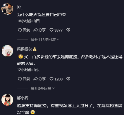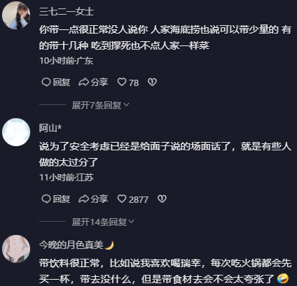 也有网友认为,吃火锅自带酒水可以理解,自带食材就比较过分了,大部分网友对不自带食材表示支持。