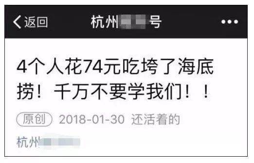 早在2018年1月,杭州吃货就有关于海底捞自带菜品的报道。杭州某公众号看到新闻说台湾海底捞店允许自带菜品,于是他们打包一堆食材去西湖边的海底捞店吃了一顿,4个人付了74元,并记录了整个过程。