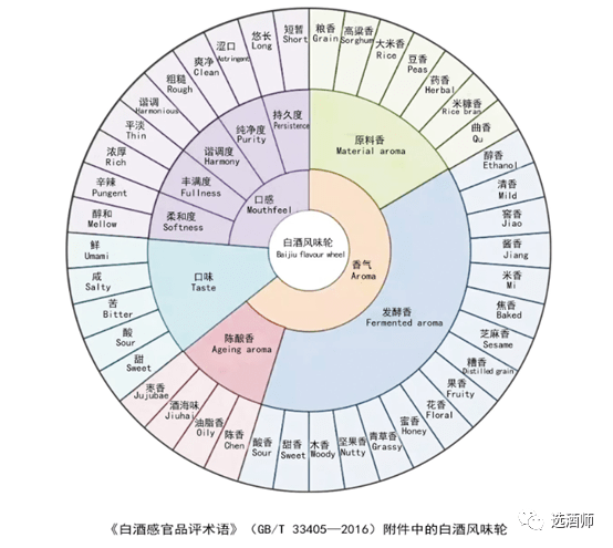 我们可以参阅白酒感官品评术语国家标准,GB/T 33405-2006附件中的白酒风味轮,从这上面可以形象的看出来,香气的描述接近2/3,口味口感也就1/3多一点。