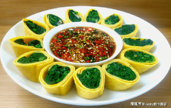 蛋皮表面放上菠菜,铺满后卷起来,再切成小块,放进盘内。吃的时候蘸料汁即可。
