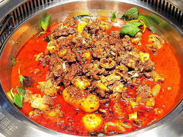 硬核菜是一锅黄焖羊,来不及拍照就被抢光。主要原因是汤锅里独出心裁地加入了一个个的耙洋芋,不仅吸饱了美羊羊的红浓汤汁,更为那锅红艳凭添了撩人的金黄……